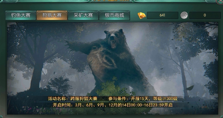 狩猎大赛:跨服狩猎大赛,开服时间大于15天 等级大于300级可参与