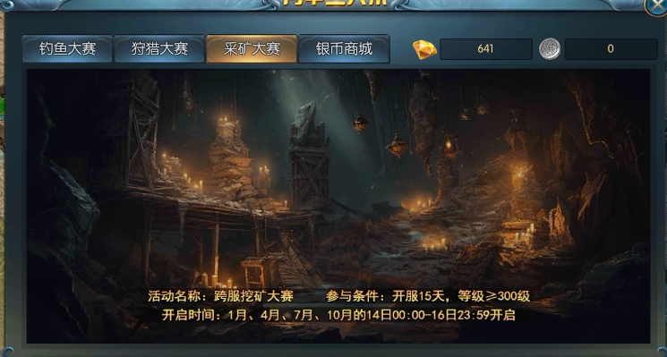 采矿大赛:跨服挖矿大赛,开服时间大于15天 等级大于300级可参与
