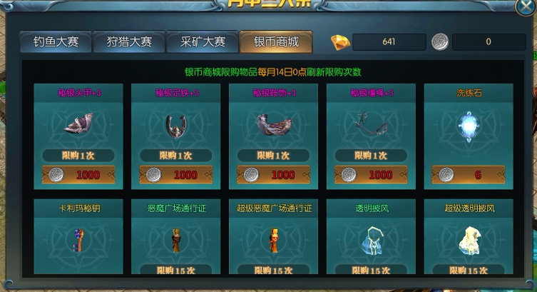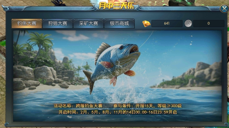 钓鱼大赛:跨服钓鱼大赛,开服时间大于15天 等级大于300级可参与